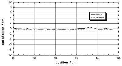 PI’s phenomenal experience in constructing nanomechanical parts was mobilized to meet this difficult challenge. We have developed over a hundred different nanopositioning systems down the past 20 years. Our performance-proven expertise and resources were pooled together to design and develop the device depicted in Fig. 12, i.e., the P-731K022 nanopositioning stage. By using capacitive sensors, the unit provides sub-nanometric resolved travel, stability through a 100 x 100 µm travel range and flatness in the nanometric region (Fig. 13).
