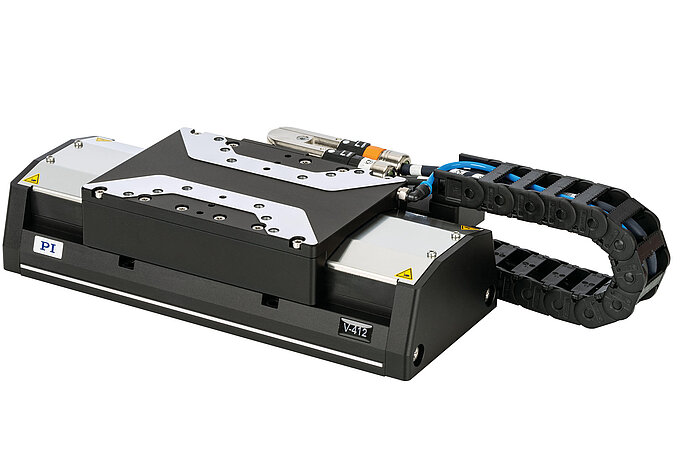Its higher-speed V-412 sibling features an ironless linear motor, and comes with an optional absolute linear encoder. The 3-phase, frictionless magnetic direct drive provides a peak force of 151N to the motion platform. This non-cogging motor design provides vibrationless smooth motion at high and low velocities and superior position control. Also like its ball screw family member, the V-412 has a cover strip on the side and the purge air connection prevents contamination of the working components by particles.