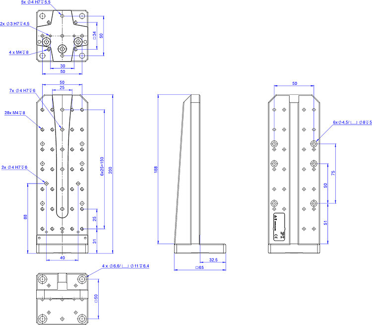 Adapter bracket for vertical mounting of positioners with up to 100 mm width and 300 mm length, vacuum compatible to 10-9 hPa