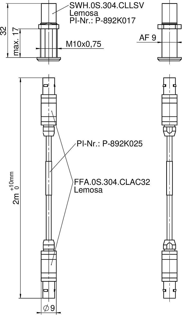 Vacuum feedthrough for piezo voltage, LEMO connector, 100 °C bakeout temperature, suitable for high vacuum (up to 10-6 hPa), including air-side cable, 2 m