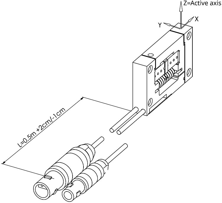Inexpensive PiezoMove linear actuator; PICMA® piezo actuator drive; 300 µm travel range; SGS, indirect position measuring; LEMO connectors; 0.5 m cable length