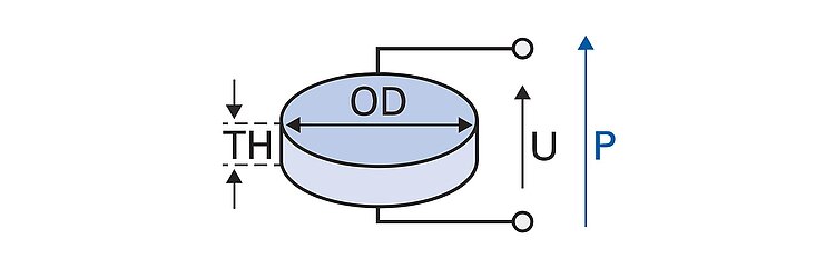 Piezoelectric disk, outside diameter (OD) = 5 mm × thickness (TH) = 2 mm, piezo material PIC255, electrode Ag screen printed