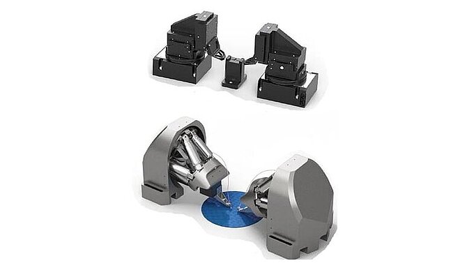 When space is a concern, a host of compact alignment solutions is available, using miniaturized stages with wear-free, high-speed linear motors, and high-precision crossed-roller guides, or – when the highest performance, cleanliness and lifetime is required – air bearings. The compact XYZ alignment stage unit above is based on an XY configuration of two A-142 air bearings slides and the V-308 voice coil linear slide with magnetic counterbalance for vertical mount.