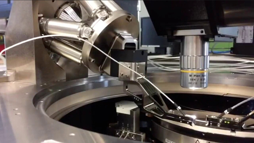 With a hexapod (parallel kinematics) or stacked multi-axis system (serial kinematics) that supports a programmable pivot, the virtual rotation center can be set directly at the fiber tip. Each angular adjustment then keeps the fiber tip stationary in space while changing only its pointing — drastically improving speed and yield in automated photonics alignment.